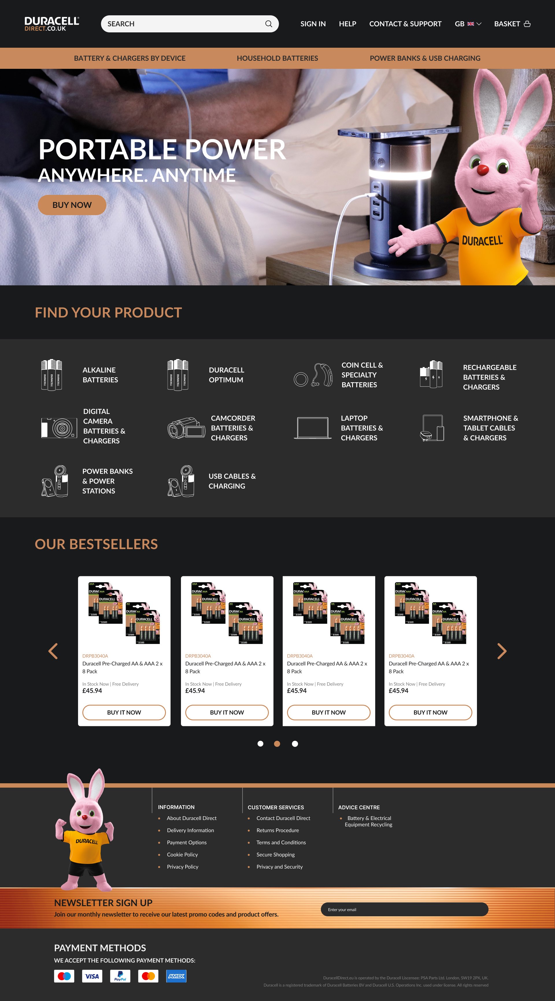 Duracell Direct is an e-commerce retailer operating as an official licensee of the Duracell brand. The site specialises in supplying genuine Duracell batteries, camera and laptop chargers as well as power banks and smartphone charging accessories, helping customers quickly and confidently find the correct power solution for their devices. The website plays a key role in communicating product reliability, making its usability and overall experience central to customer confidence and conversion. In this project, I redesigned the website with a modern, fresh look that reflects their innovative products and core values of trustworthiness.