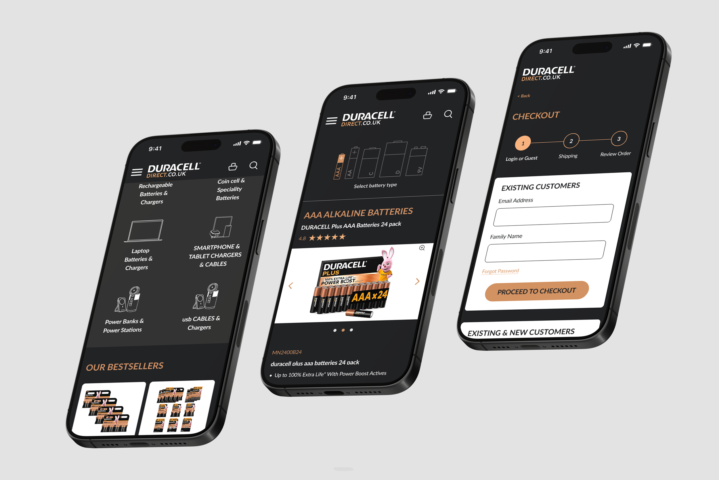 Build a straightforward, up-to-date, and reliable online shopping experience that lets users quickly find and buy the right power solution for their device. The new site should boost trust, make it easier to use and navigate, and show Duracell Direct as a trusted, official place for Duracell products. The look and feel should also be more in line with Duracell.com and in keeping with their dark backgrounds and copper accents